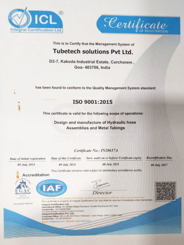 We are an ISO 9001:2015 certified company, committed to delivering world-class hydraulic hose assemblies and metal tubing solutions. All our products are tested as per SAE and DIN international standards using advanced pressure-testing systems from Hydratron UK.